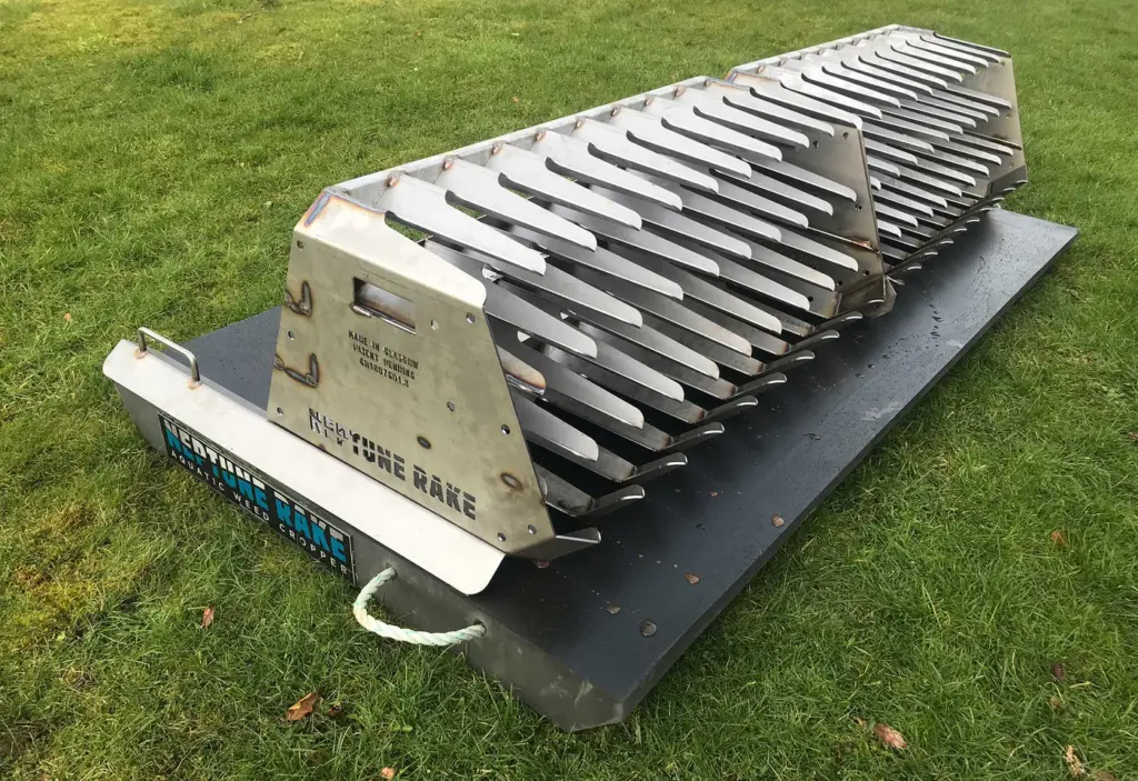 In 2025 we purchased a Neptune Rake to combat the weed in our waters. This is a large aluminium rake which gets launched from its float to dive down to the bottom of the lake and then is winched in by a motor which is secured on the bank side.